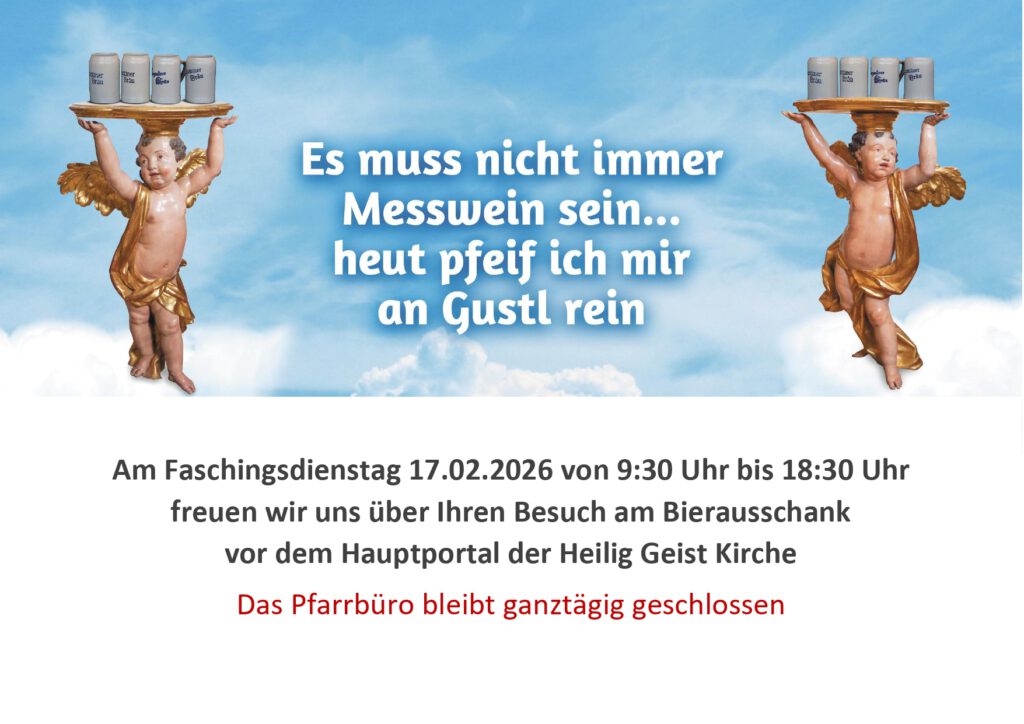 Am Faschingsdienstag ist die Hl. Geist Kirche ganztags geschlossen. Um 10:00 Uhr wird in St. Peter die Hl. Messe gefeiert.